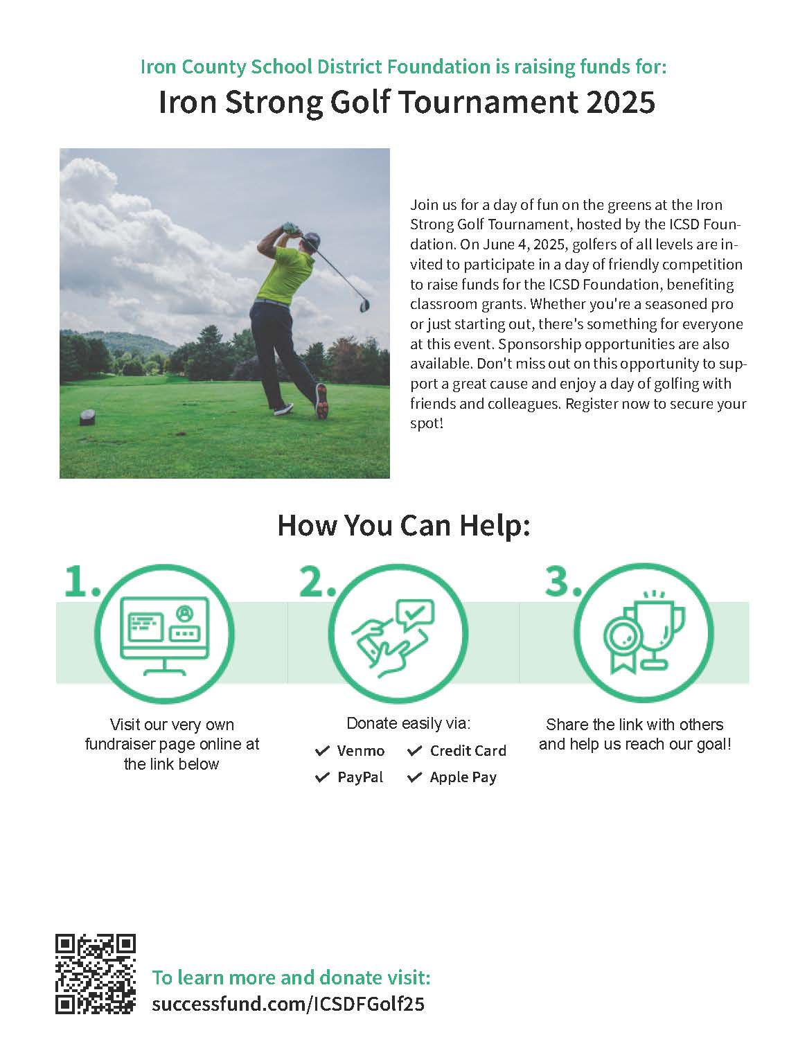 The annual Iron County School District Foundation Golf Tournament is scheduled for June 4, 2025.